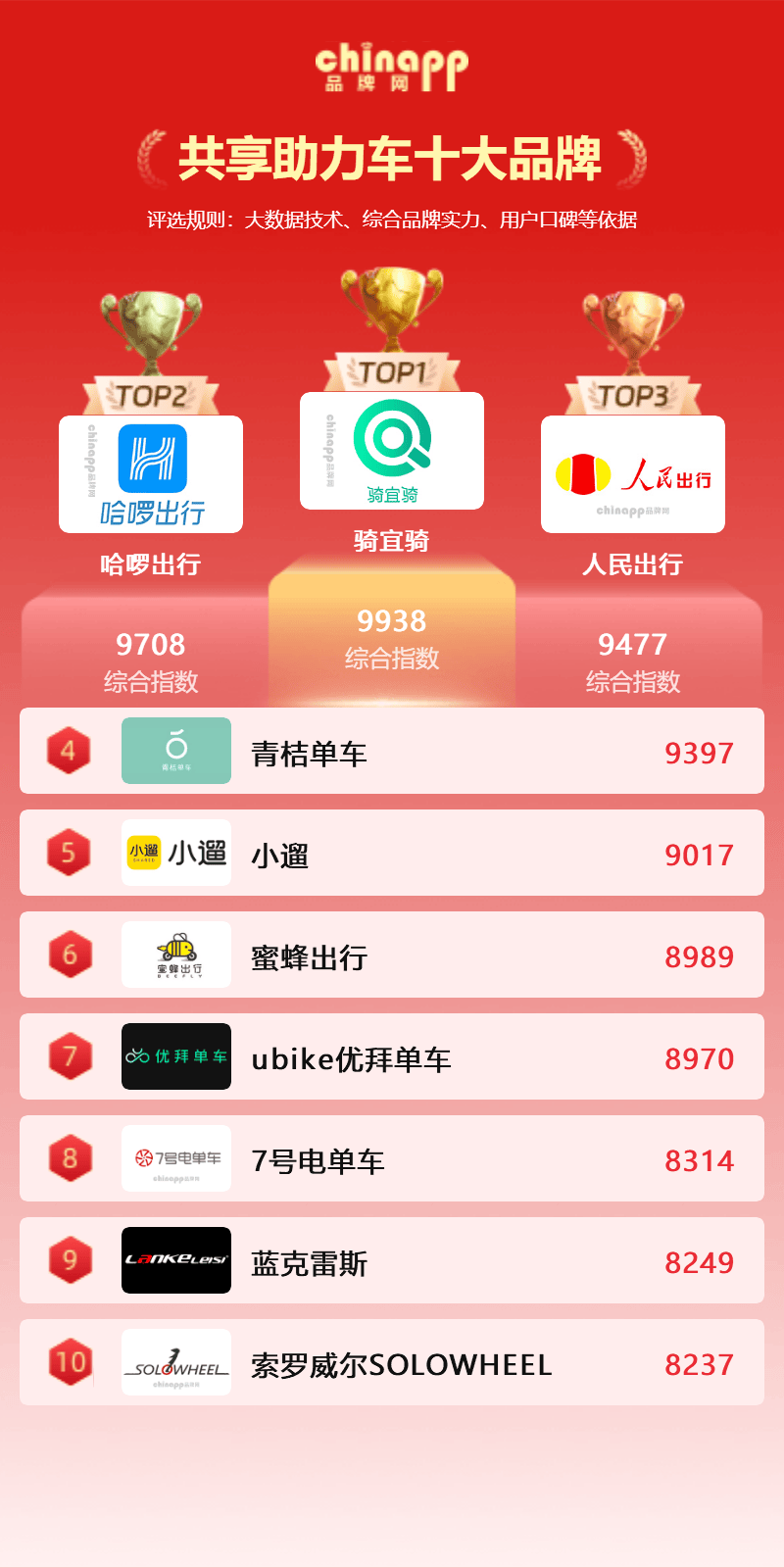 品牌网chinapp综合市场调研、专业评测及用户口碑数据,发布了《2025年共享助力车十大品牌排行榜》,前十名分别是:骑宜骑、哈啰出行、人民出行、青桔单车、小遛、蜜蜂出行、ubike优拜单车、7号电单车、蓝克雷斯、索罗威尔SOLOWHEEL。本文按照最新市场价值与品牌实力,为您呈现共享助力车十大品牌深度解析: